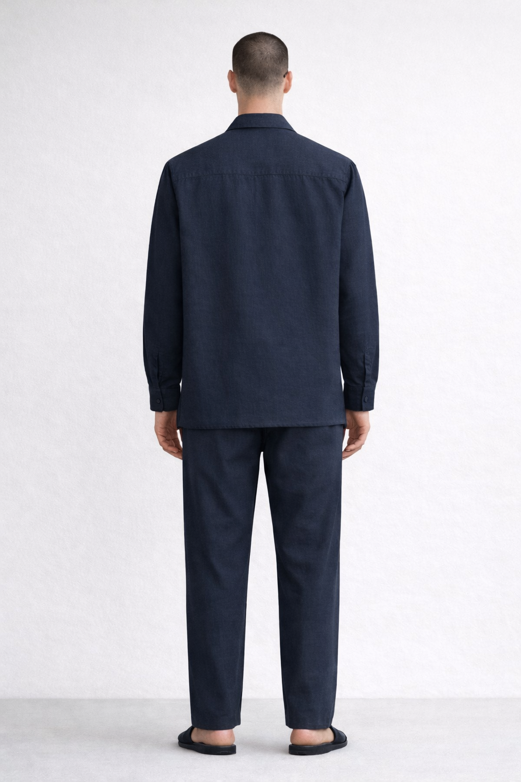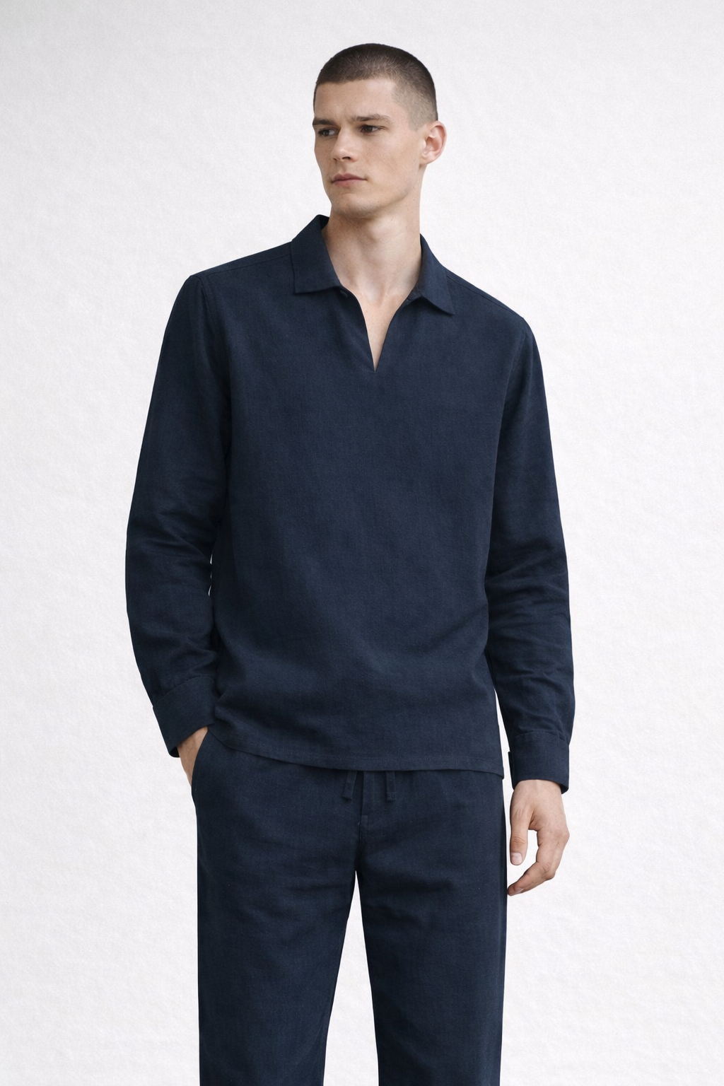 Design details: Long-sleeve pullover shirt featuring a relaxed Johnny collar with a clean split neckline for effortless smart-casual style.