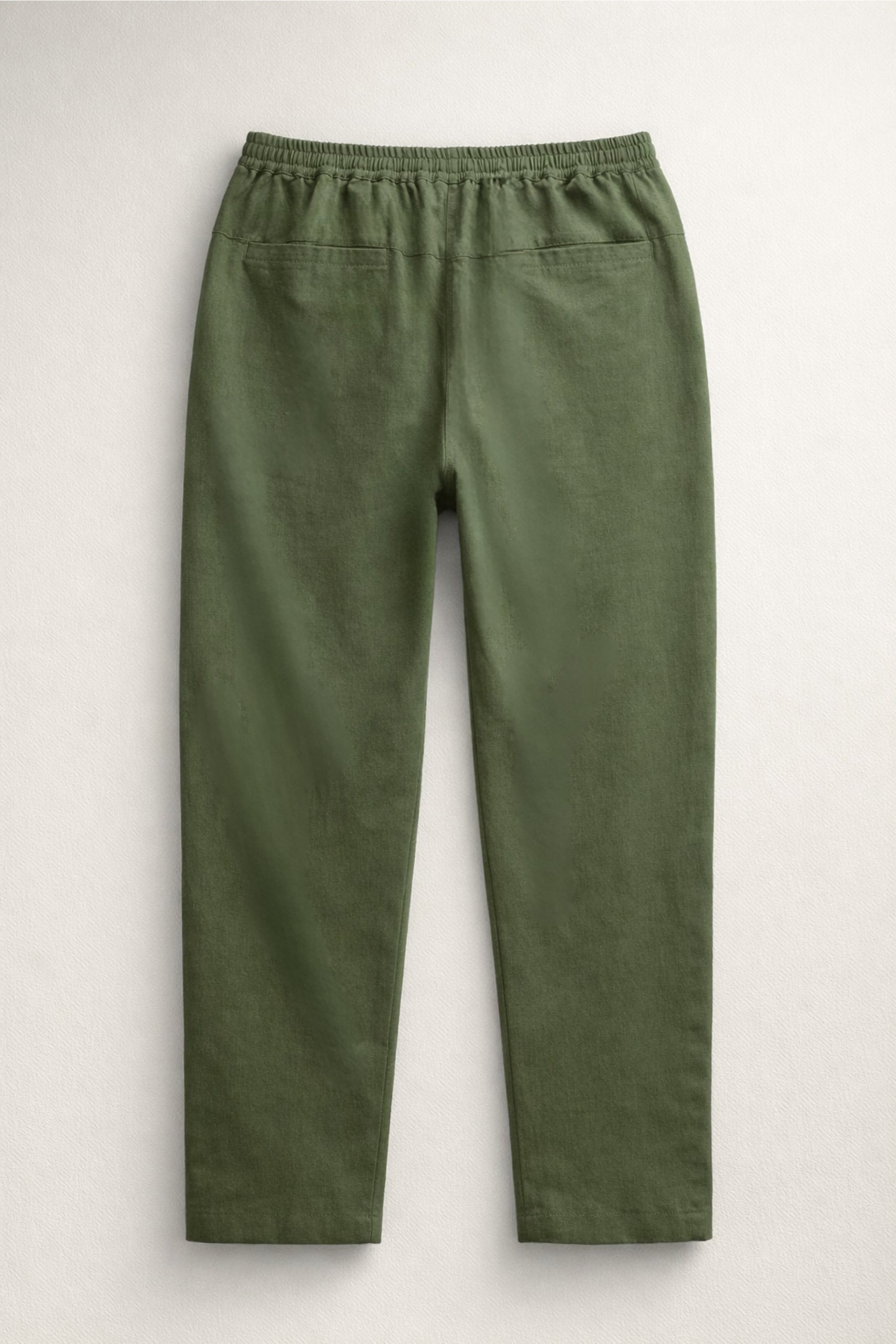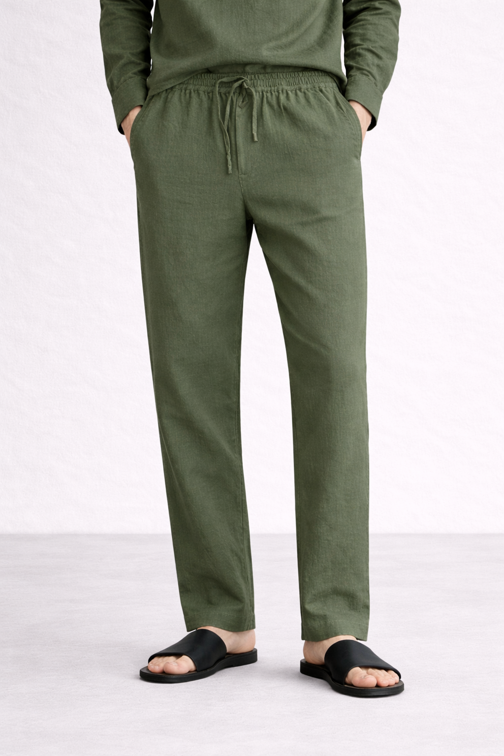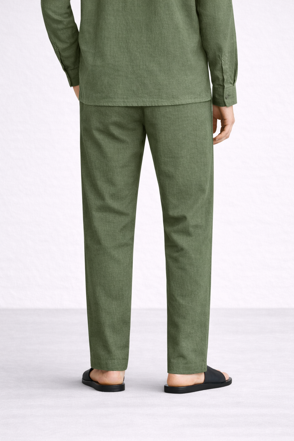 Design details: Relaxed trousers with cross pockets and pleats at front. Elasticated waist band with drawstring.