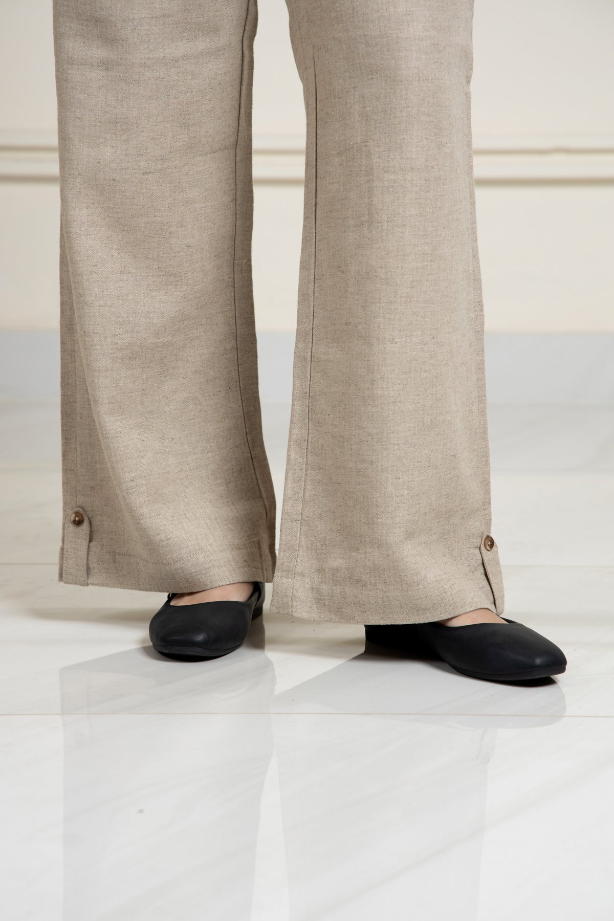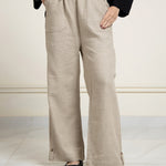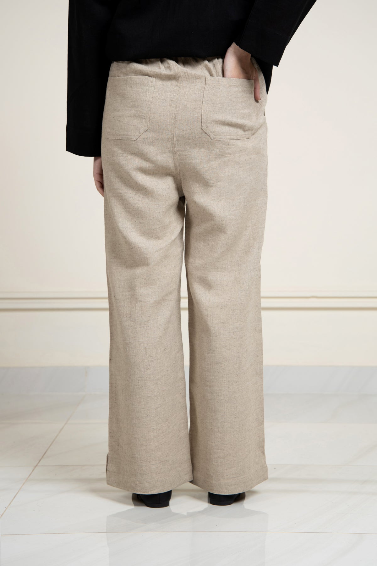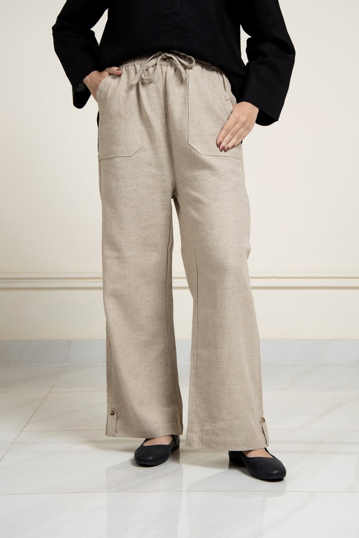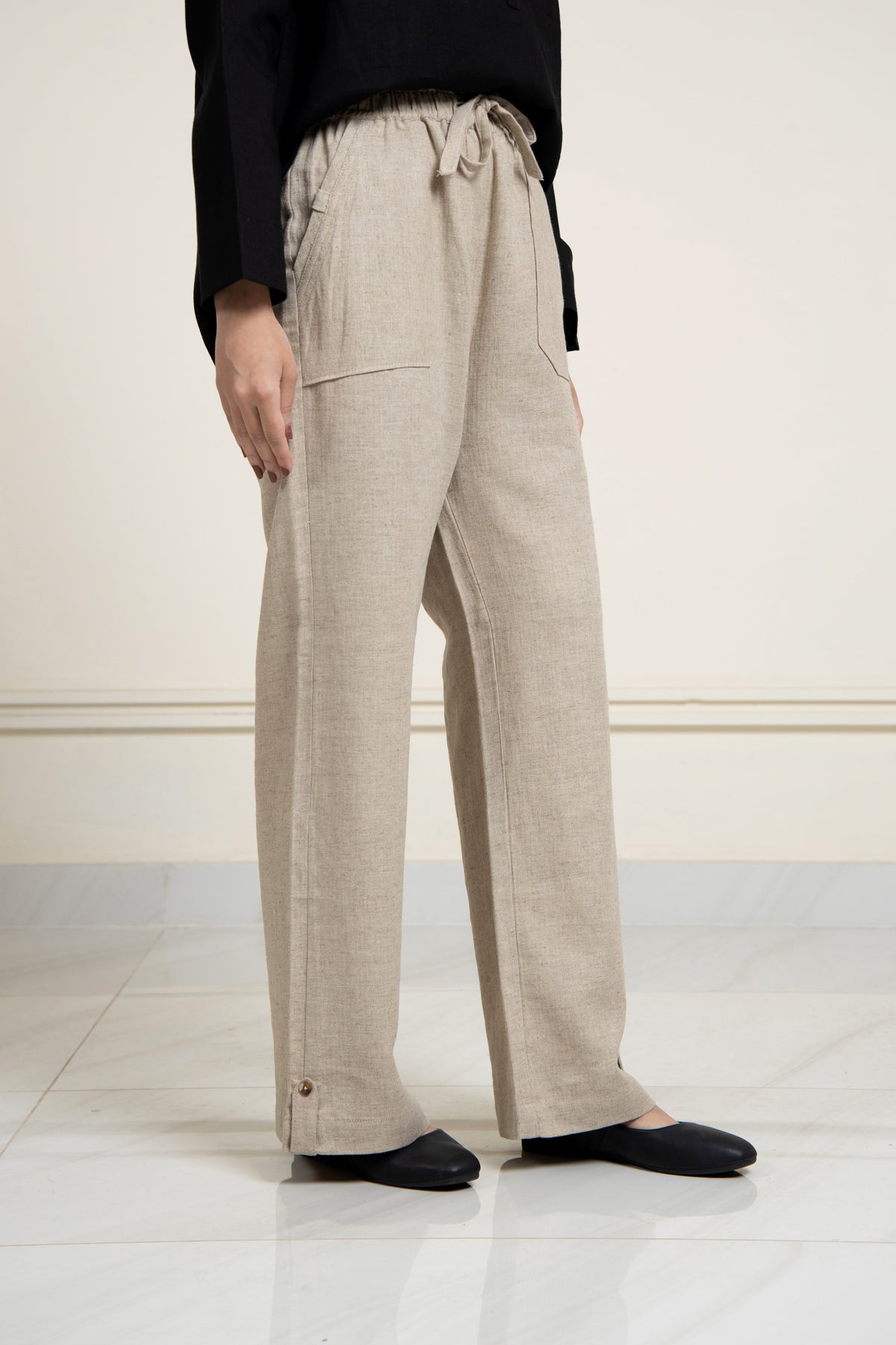 Design details: Straight legged linen trousers with cross posckets and drwacord