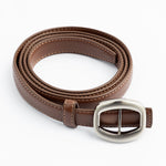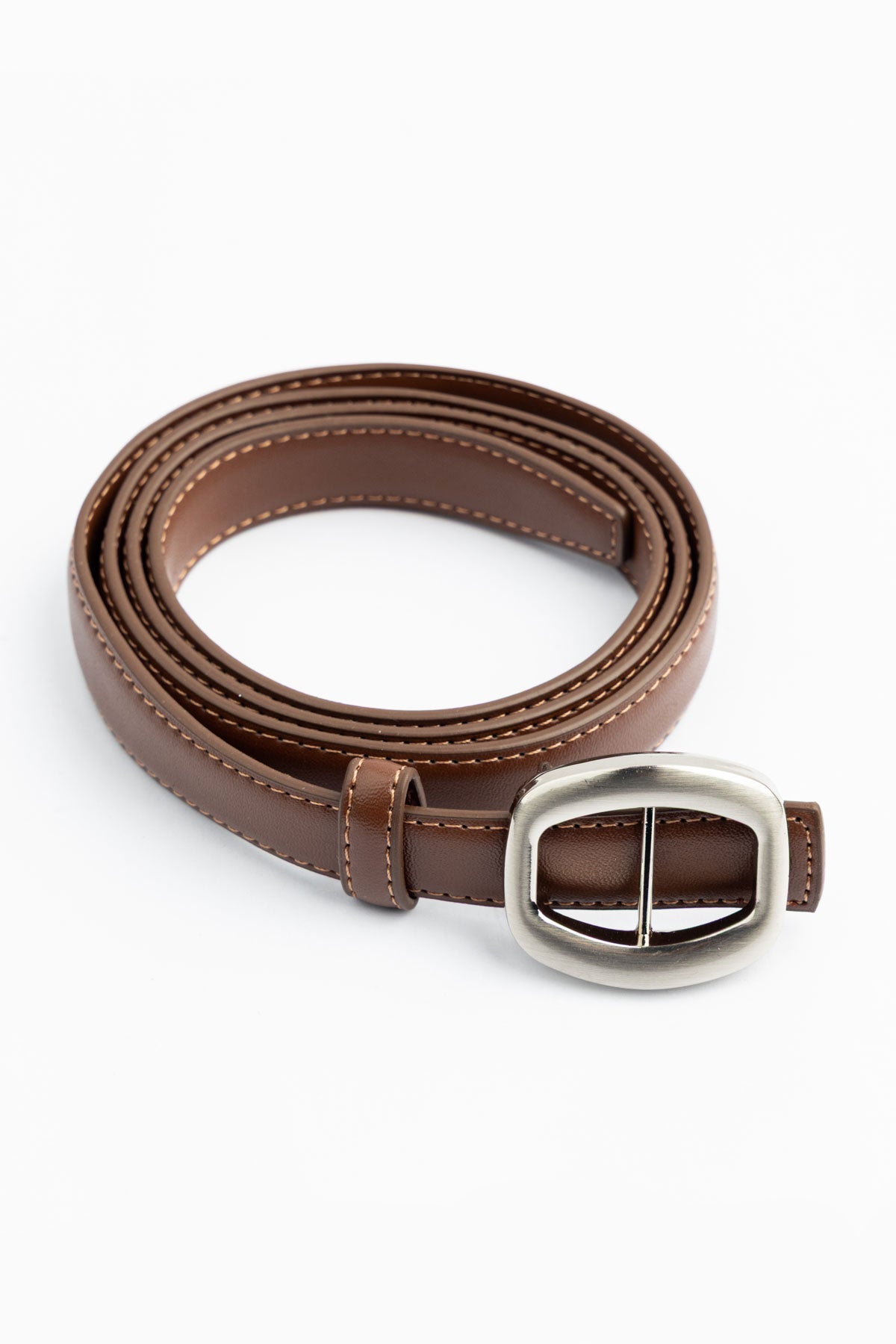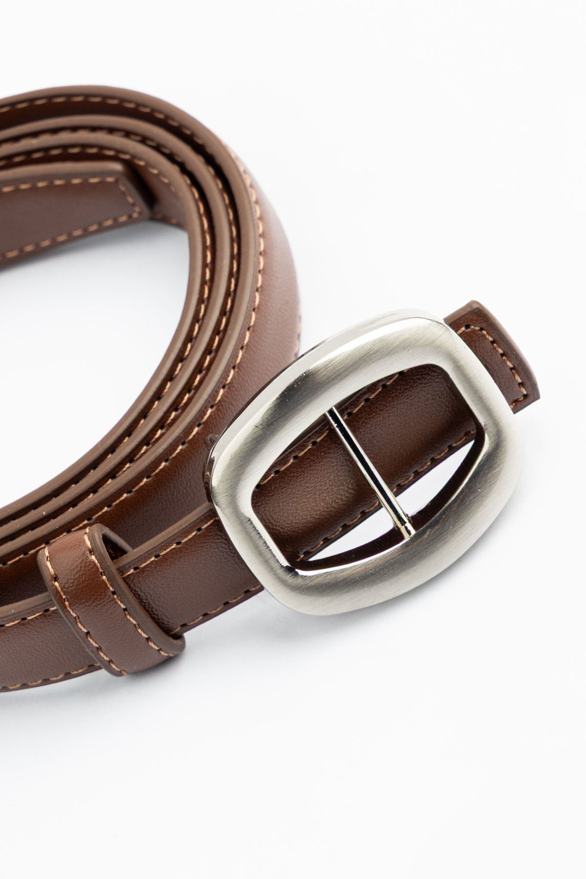 Simplicity meets sophistication in this sleek brown belt made from smooth polyurethane leather. Designed for everyday elegance, the belt features contrast stitching for added style and a modern brushed silver buckle that enhances its minimalistic appeal. It’s a versatile accessory suitable for both office attire and casual ensembles.