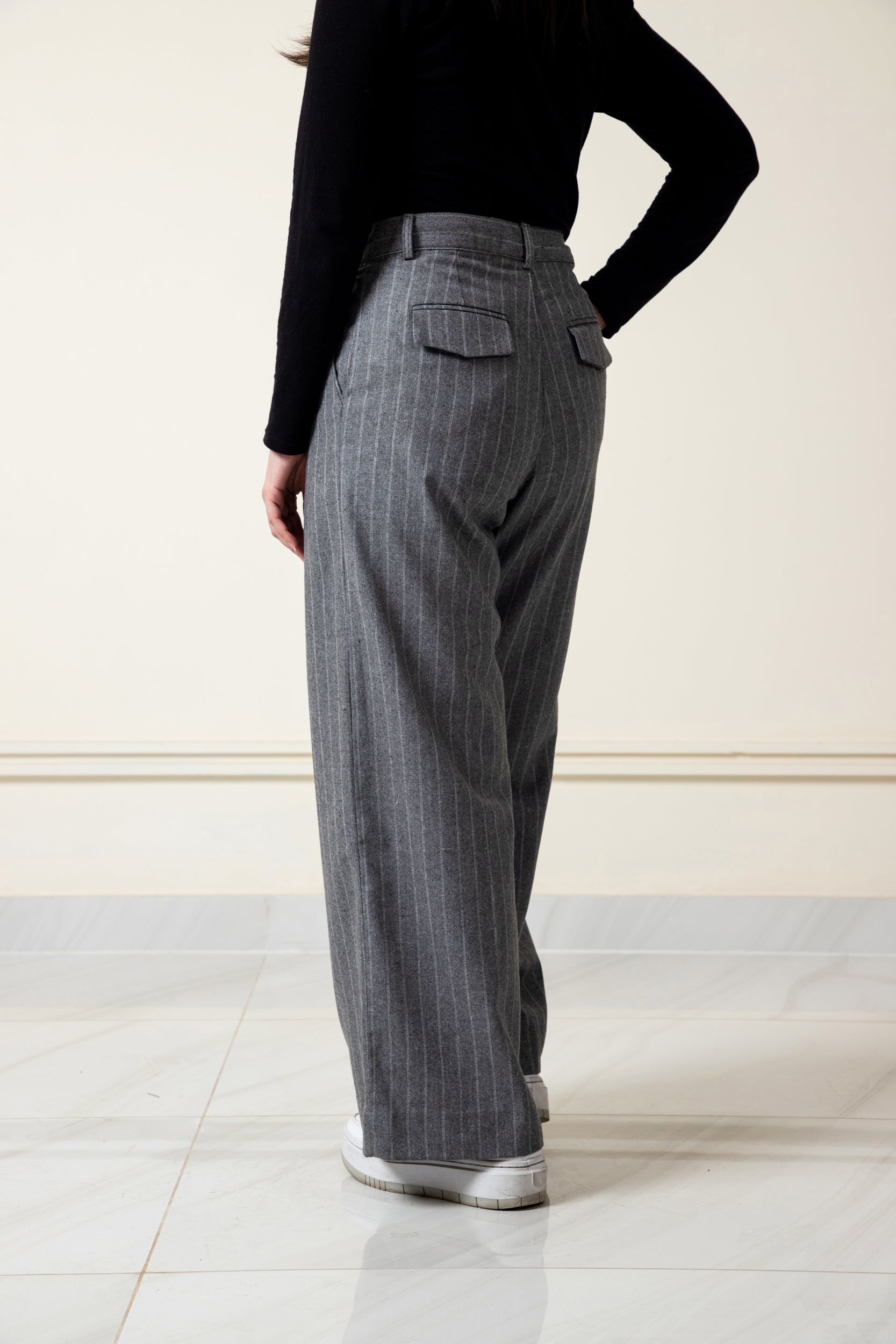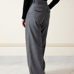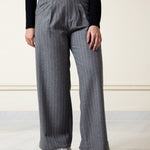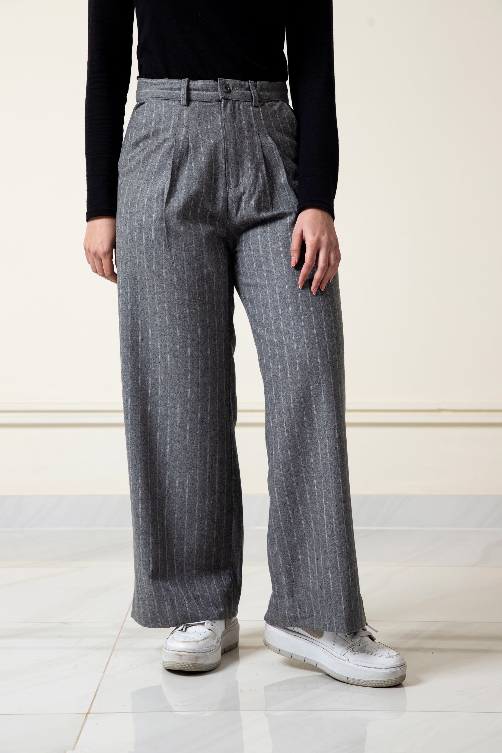 Step into effortless style with our Grey Pinstripe Wide-Leg Pants. Featuring a chic pleated design and a flattering wide-leg fit, these pants are perfect for work or casual outings. Crafted from premium fabric, they offer comfort and elegance in one. Pair them with your favorite top and sneakers or heels for a timeless look.