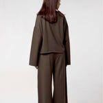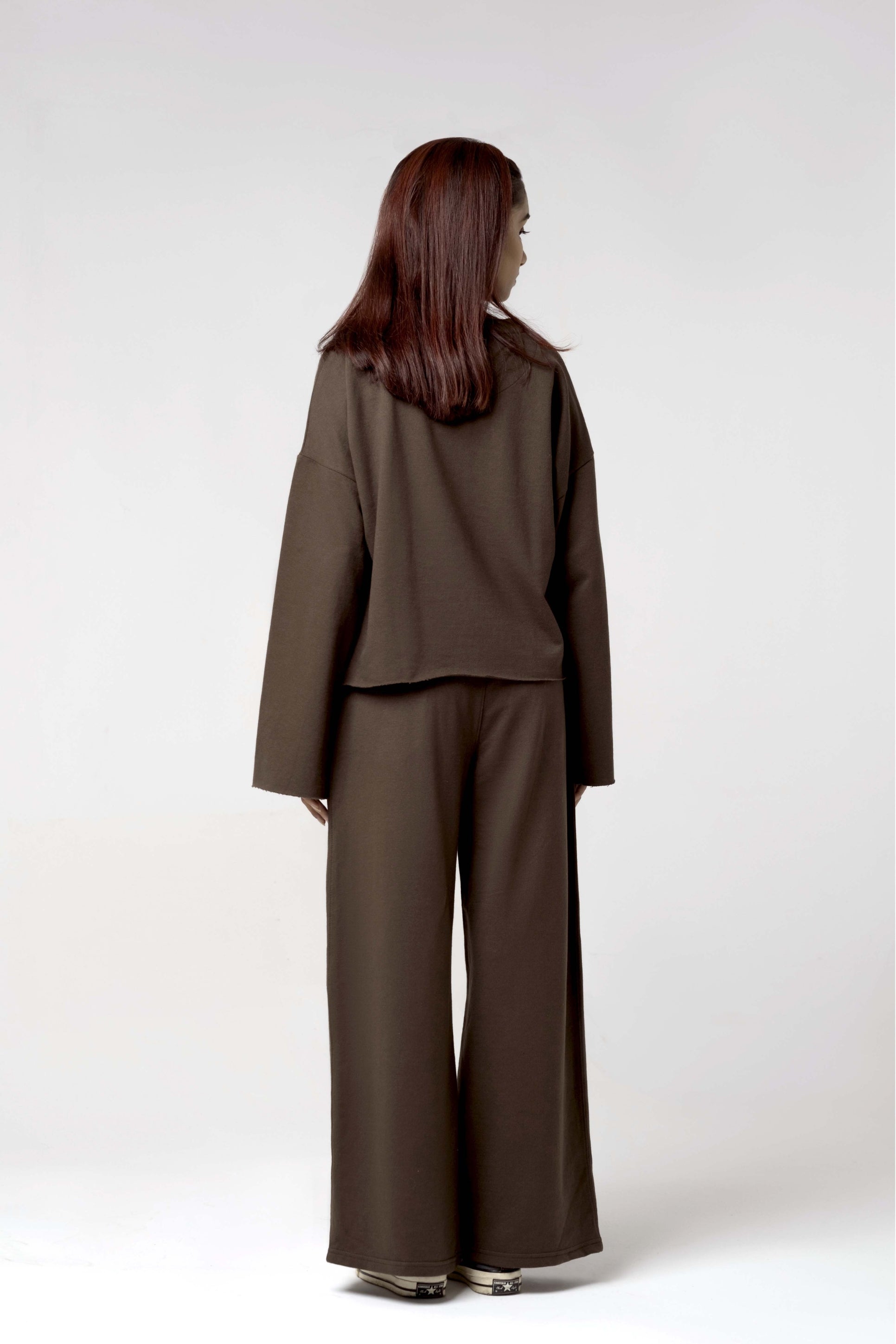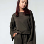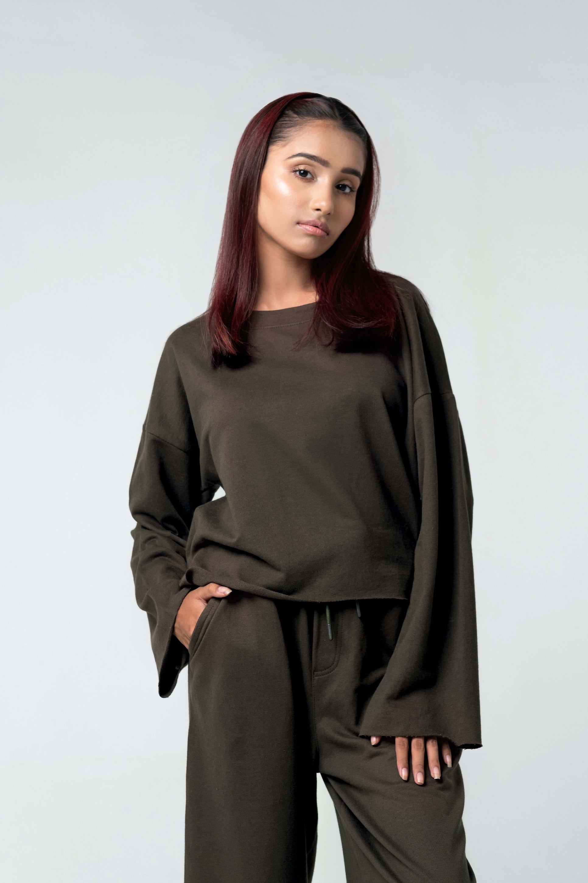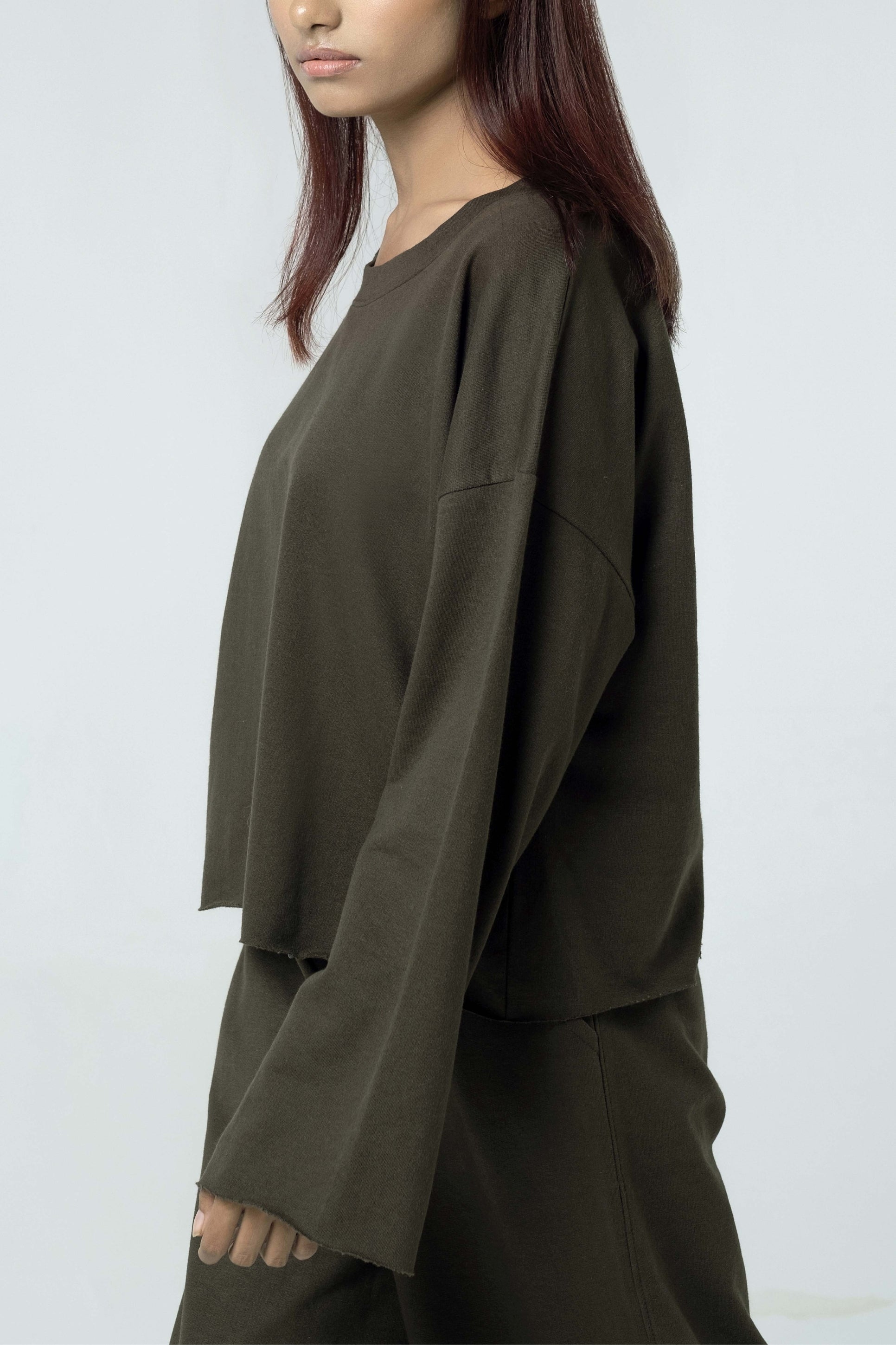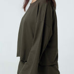 This olive green cropped sweatshirt features a wide round neck, offering a relaxed, contemporary silhouette with a simple, versatile design perfect for everyday wear.