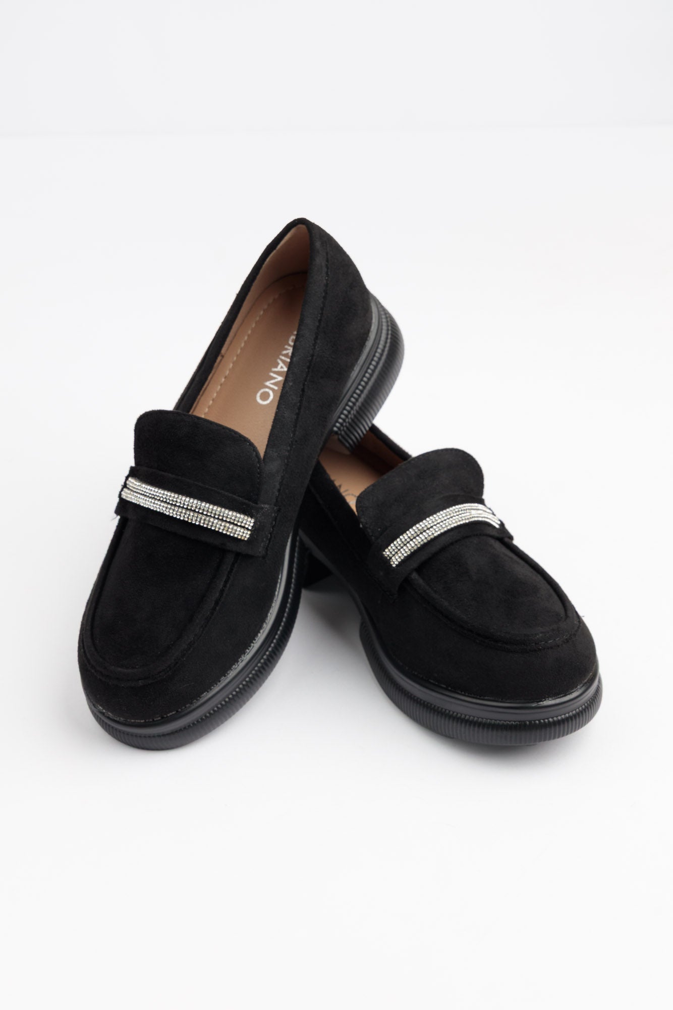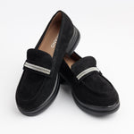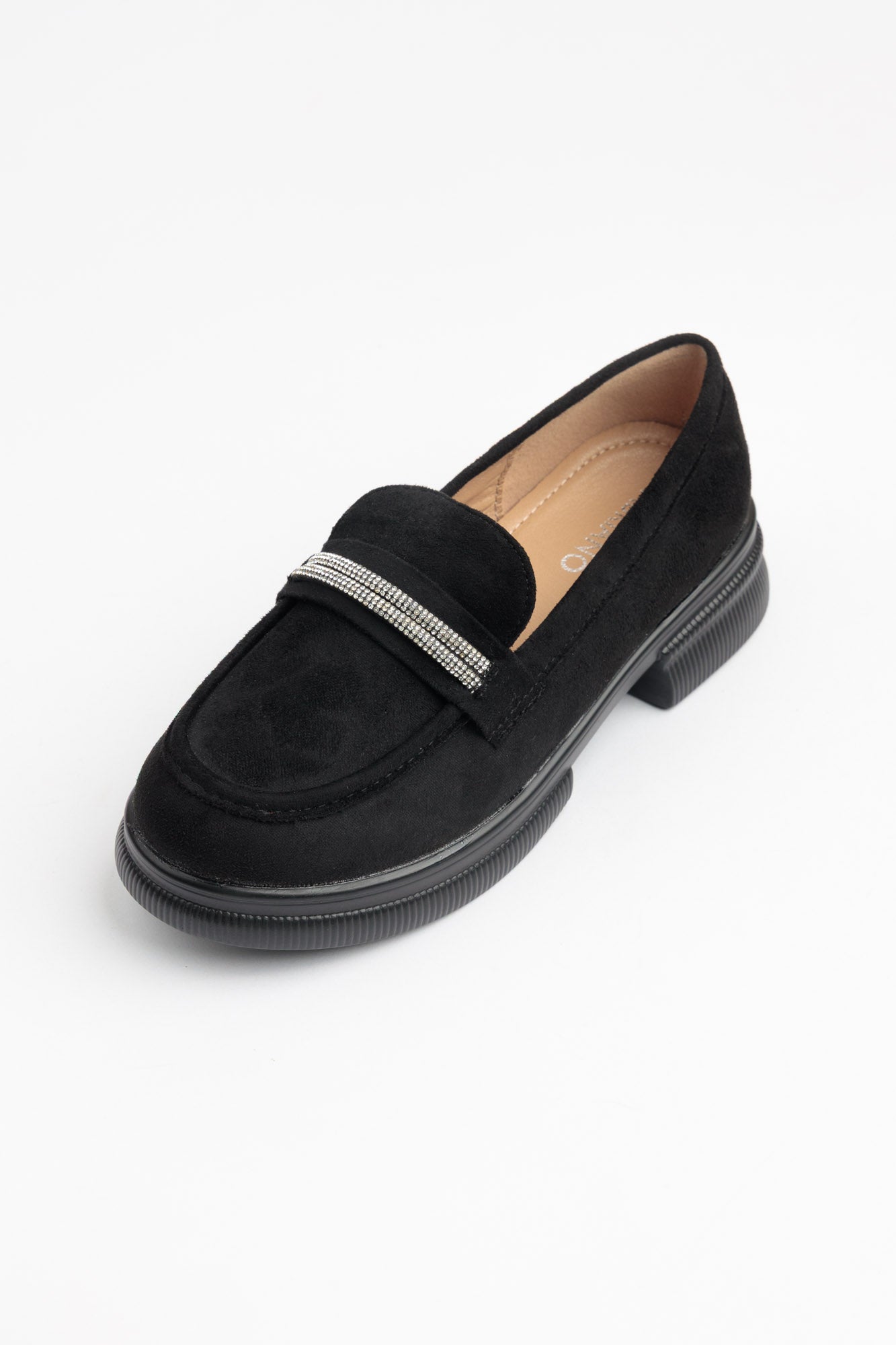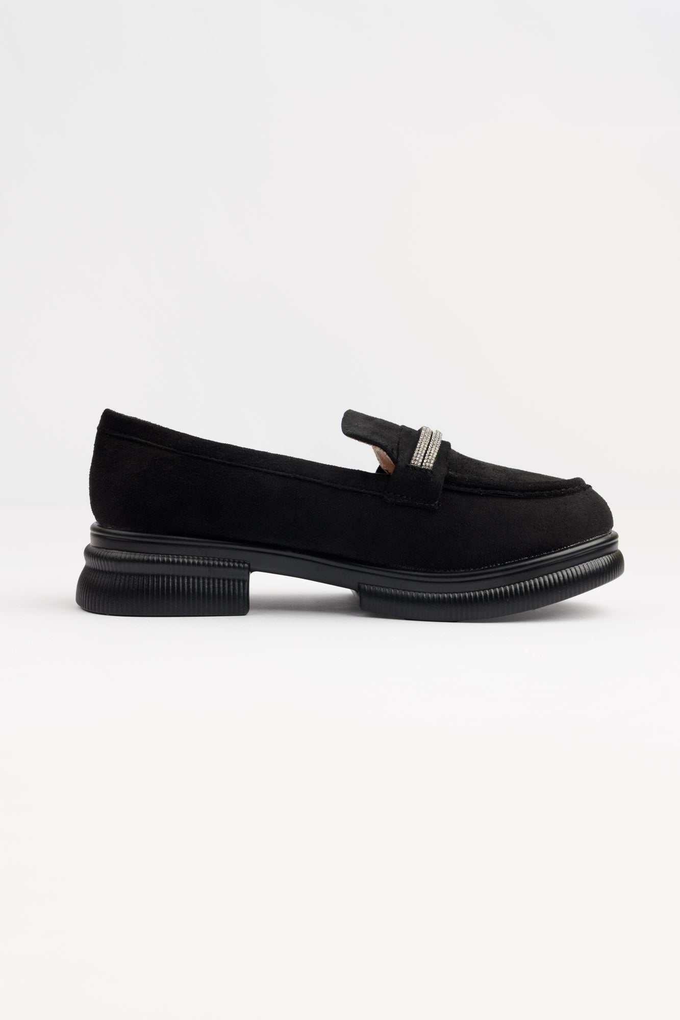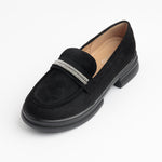 Modern pearl loafers featuring a decorative metallic strap and smooth suede texture. A perfect blend of elegance and comfort for refined everyday wear.
