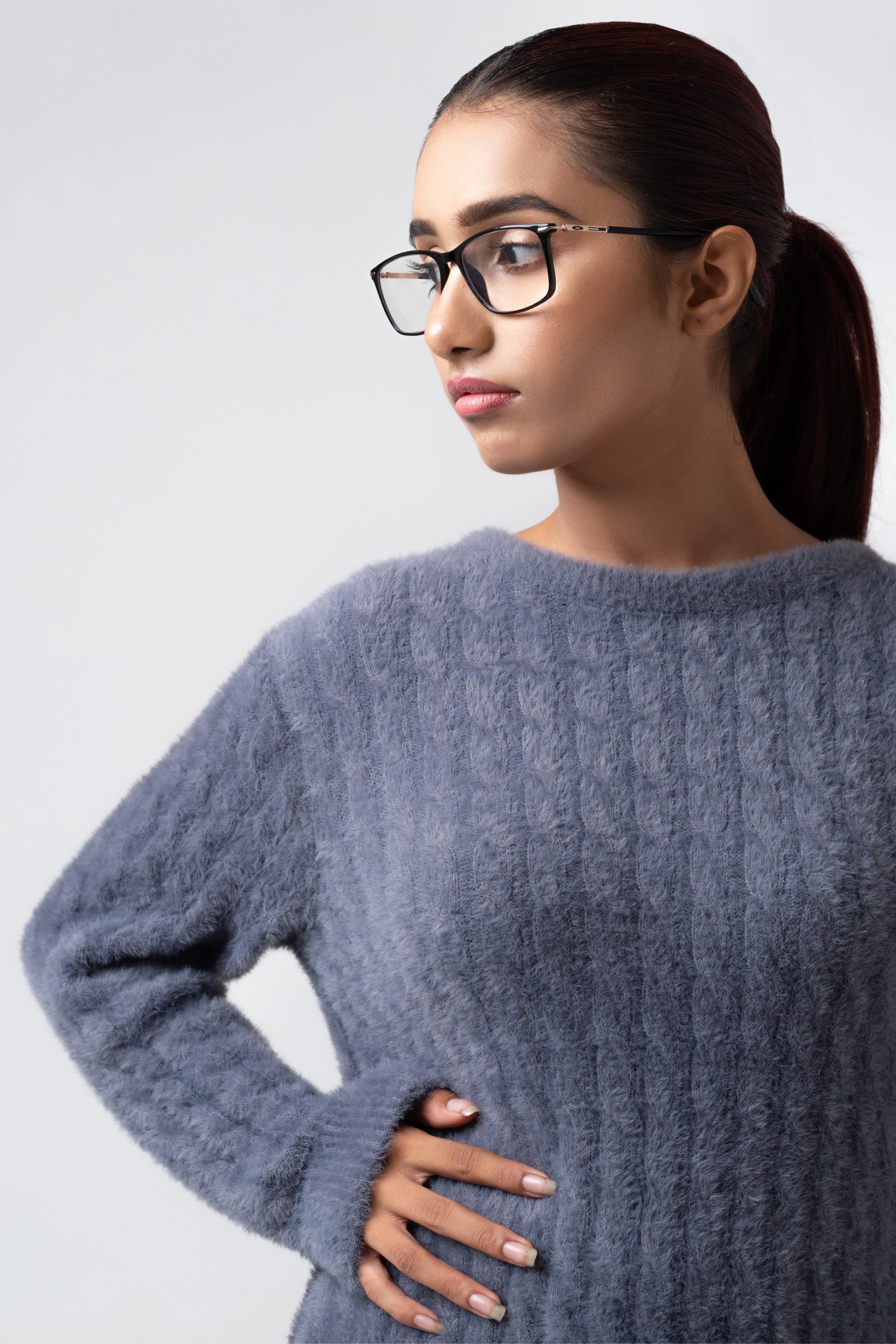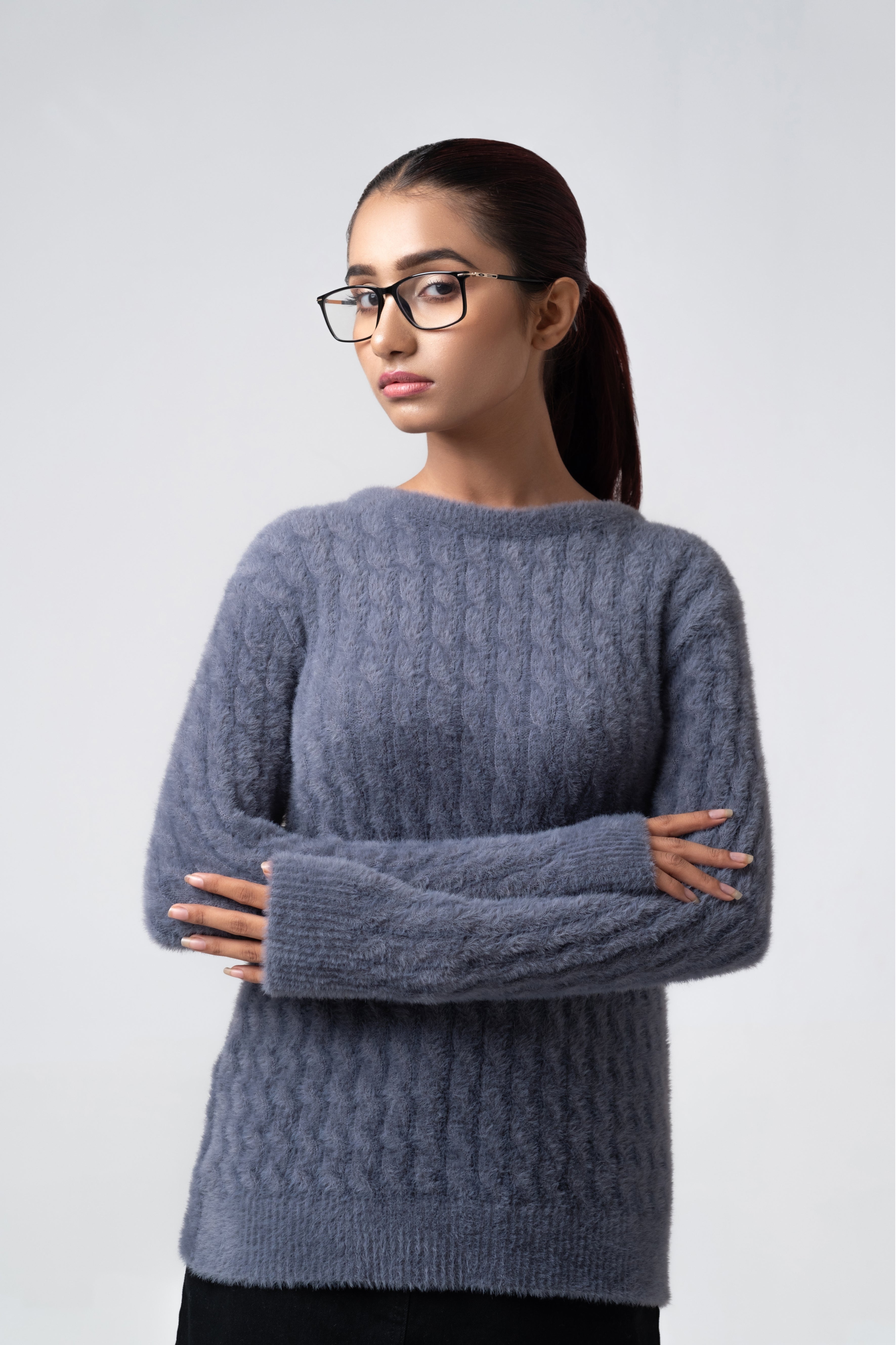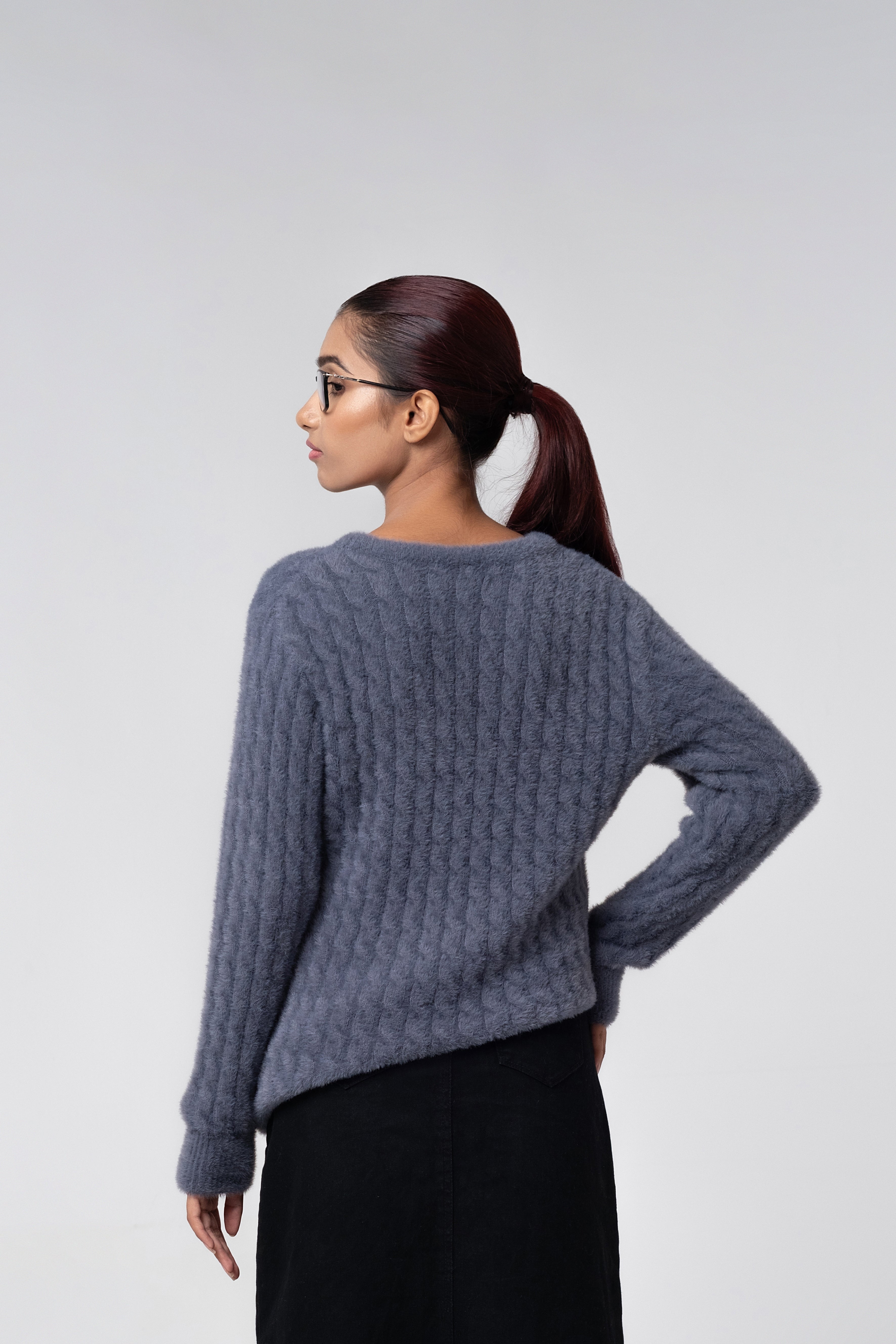 Design detail: A long comfy jumper in Feather texture featuring a crew neck & full sleeves